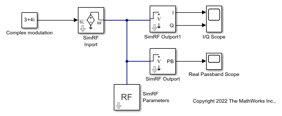 The model, ex_simrf_tut_passband_model, shows how to modulate a real passband signal with in-phase and quadrature components.