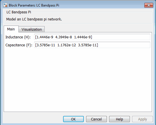 1. Double-click the LC Bandpass Pi block to open the block dialog box.