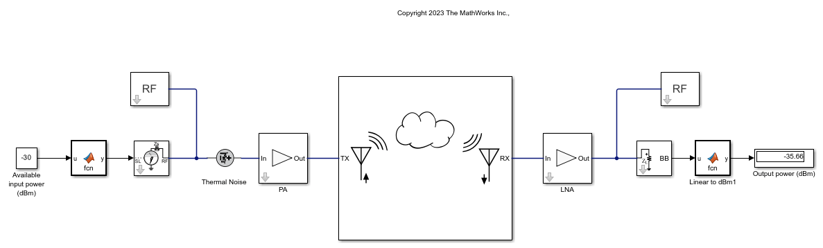 The simrf_channel.slx model includes a simple transmitter that consists of a signal source and power amplifier, as well as a simple receiver that includes a low-noise amplifier. To establish the connection, insert the Channel block between the transmitter and receiver systems.