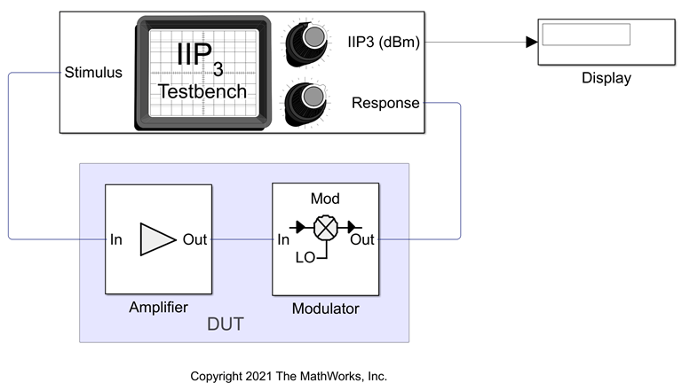 Use the IIP3 Testbench block to measure the input third-order intercept (IIP3) of device under test (DUT).
