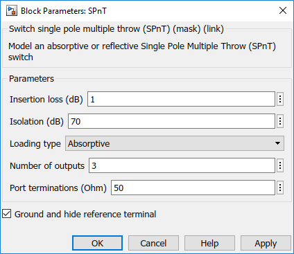 Open the SPnT block to see set values. Currently the switch is set to Absorptive using the Load Type parameter.