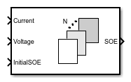 The SOE Estimator (Energy Counting) block implements an estimator that calculates the state of energy (SOE) of a battery by using the energy counting method.