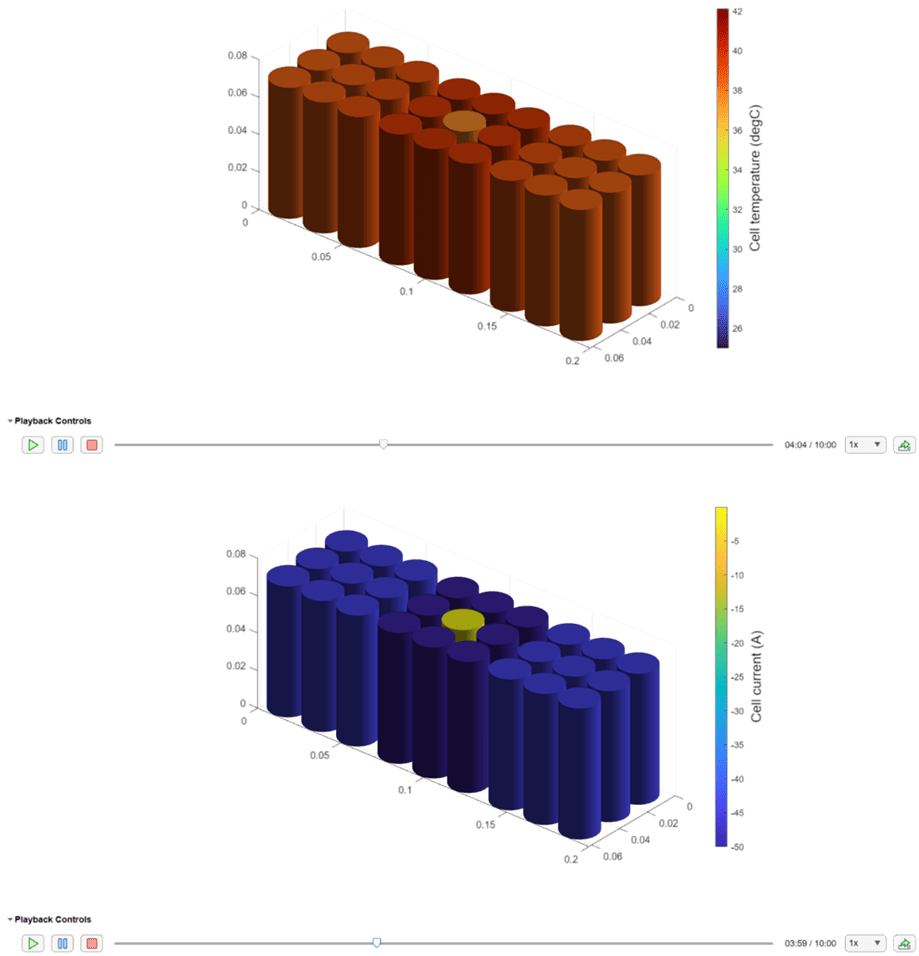 f = uifigure(Color="w"); g = uigridlayout(f,[2 1]); packChart = batterySimulationChart(g, ... batterySimLog); packChartColorBar = colorbar(packChart); ylabel(packChartColorBar,strcat("Cell temperature"," (",batterySimLog.SelectedVariableUnit,")"),FontSize=14);
