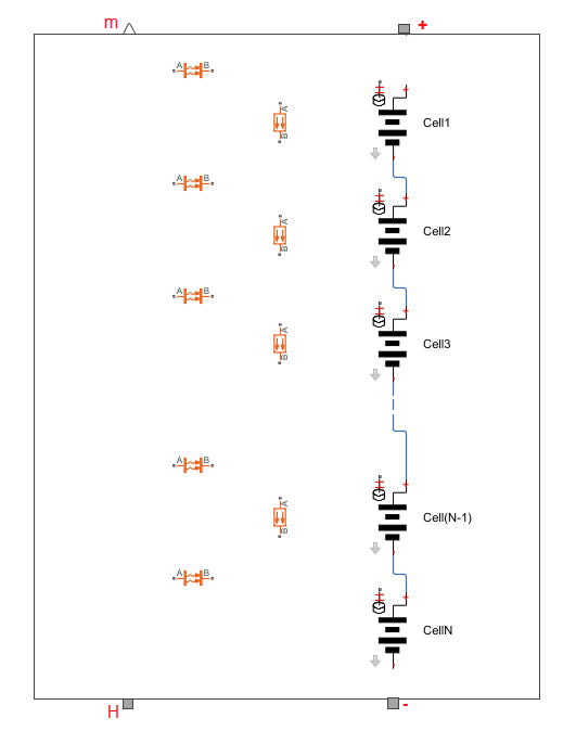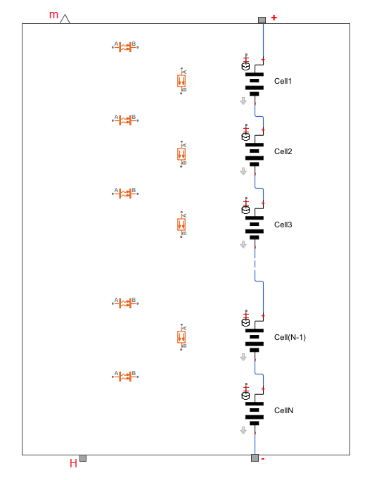 The Battery Pack block generated from this composite component has two electrical ports, + and -, a thermal port, H, and a physical signal output port, m. The parameters modifiable through the block interface include the number of cells in the battery pack and the position of the faulted cell. The block user can modify the parameters of the faulted cell to see the impact of the fault on battery performance and cell temperatures.