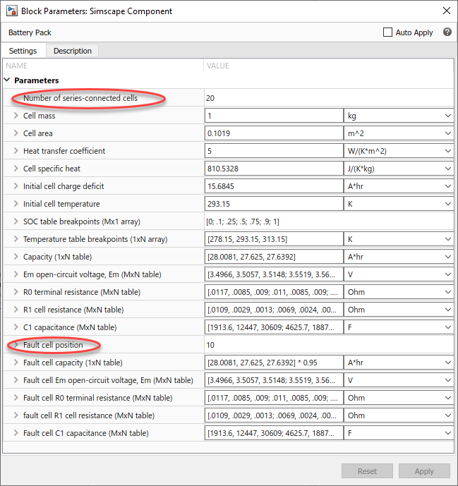 For each member, associate its parameters with the top-level parameters of the composite component. For the iterator value that corresponds to the faulted cell position, specify the faulted cell parameters instead of the respective generic ones, as needed. For example, all cells have the same cell mass: