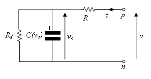 i == (C0 + Cv*vc)*der(vc) + vc/Rd;Summing voltages gives the second Simscape equation: