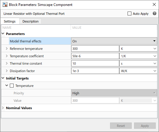 If the control parameter, Model thermal effects, is set to Off, the block represents a linear resistor. The only exposed block parameter is Nominal resistance, the Initial Targets section lets you set targets for Current and Voltage, and the block icon has two ports, + and -.