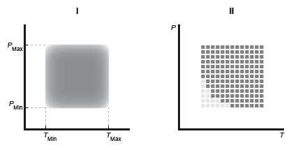 2D tables based on temperature and pressure— Provide tabulated data against both temperature and pressure. The region of valid temperatures and pressures is specified in terms of minimum and maximum values (I in the figure) or in terms of a validity matrix (II).Validity Region Types