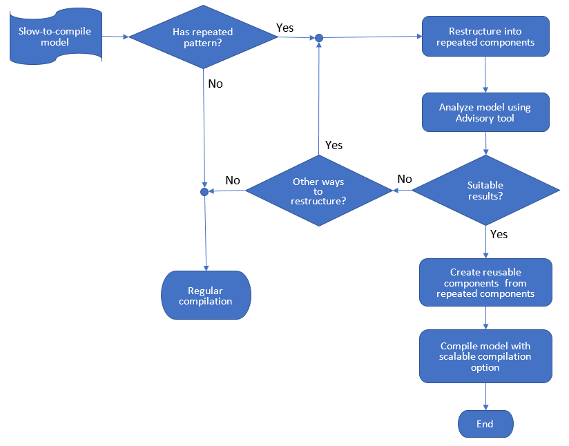If the performance improvement from scalable compilation is not satisfactory, consider whether there are other possible ways to restructure the model. The complexity level of the repeated components has significant impact on scalable compilation results. You can try different ways of restructuring your model into repeated components and use the Advisory tool to determine the optimal configuration.