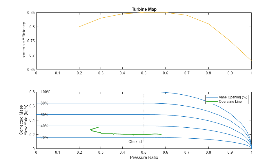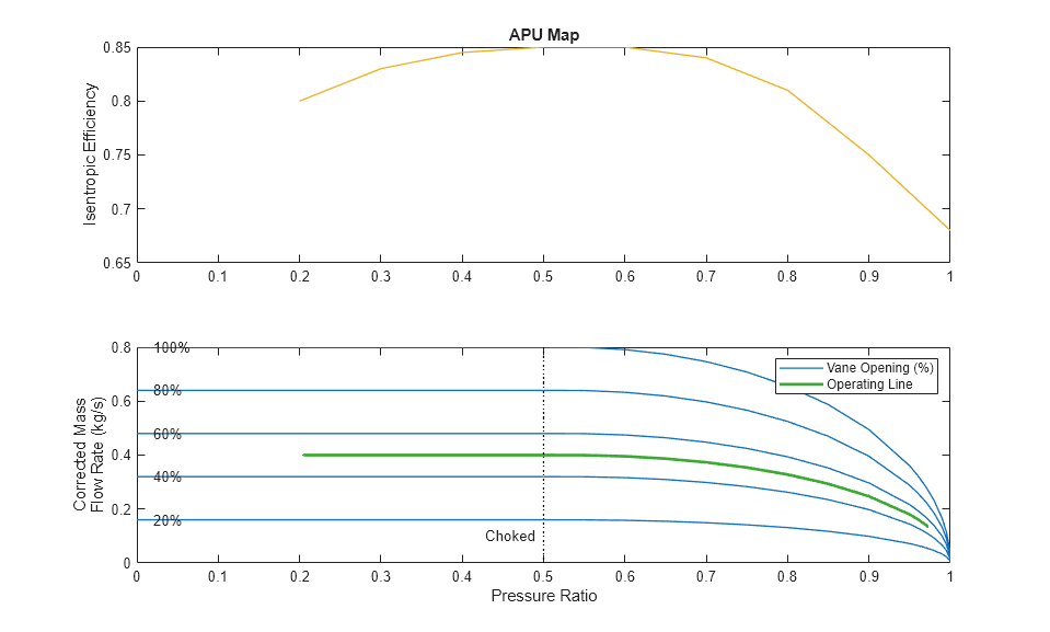 Three PID controllers regulate the shaft speed, the turbine inlet temperature, and the compressor surge margin. System inputs are defined for three scenarios: varying shaft speed, varying surge margin, and varying APU vane opening. Running the first scenario produces the typical operating line on the compressor map. Running the second and third scenarios show where the maximum power output and maximum global efficiency occurs.