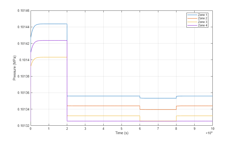 This example models a ventilation circuit in a building. The air volume inside the building is divided into four zones. The ventilation unit blows cool air into Zone 1 and extracts air from Zone 3. The extracted air can be optionally recycled back into Zone 1. A door in Zone 4 can be opened to vent air out to the atmosphere.