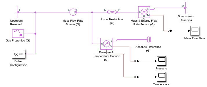 In the Simple Gas Model tutorial, you created a simple open-loop gas model. This example shows how to modify this model by changing the gas flow boundary conditions without affecting temperature. To open the completed model, in the MATLAB® Command Window, type ssc_gas_tutorial_step2.
