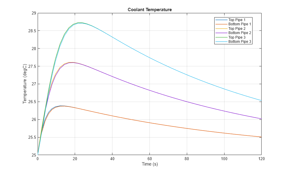 This plot shows the temperature of the coolant at different locations in the system over time. Each curve corresponds to a segment of the cooling channels.