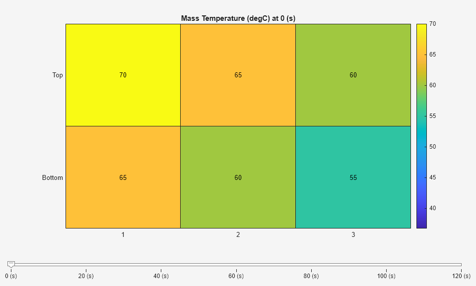 This plot shows a heat map of the temperature of the cooling plate over time. Each heat map cell corresponds to a thermal mass in the system. You can adjust the simulation time using the slider at the bottom of the figure.