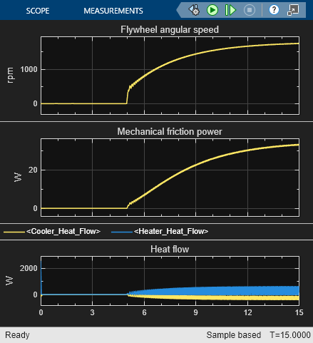 The model simulates 15s of Stirling engine start-up, by applying an impulse at t = 5s to set the flywheel in initial motion.