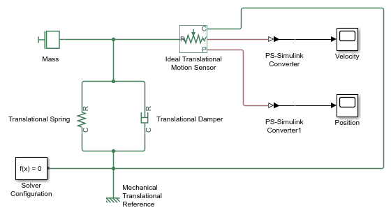 Create a simple mass-spring-damper system. Use the Mass, Translational Spring, Translational Damper, Mechanical Translational Reference, Ideal Translational Motion Sensor, PS-Simulink Converter, Solver Configuration, and Scope blocks, and connect them as shown in the following illustration.