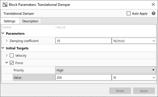 Double-click the Translational Damper block, expand the Initial Targets section, select the check box next to the Force variable, change its Priority to