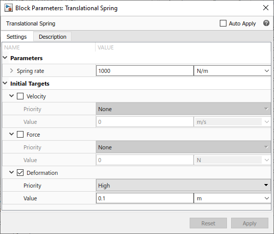 ode23t (mod.stiff/Trapezoidal)and Max step size to0.2. Also adjust the Simulation time to be between 0 and 2 seconds, by setting Stop time to2.0.Specify the initial deformation of the spring. Double-click the Translational Spring block. In the block dialog box, expand the Initial Targets section, and then select the check box next to the Deformation variable. Keep its Priority as