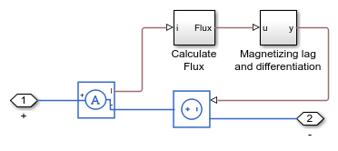 For numerical efficiency, the underlying behavior is defined in terms of a current-dependent flux. A magnetizing lag helps with differentiating the flux to obtain voltage. The lag does not significantly affect simulation results, provided that the minimum time step is at least an order of magnitude greater than the lag time. Parameters for the source and lag are defined in the workspace so that the expected voltage can be calculated analytically.