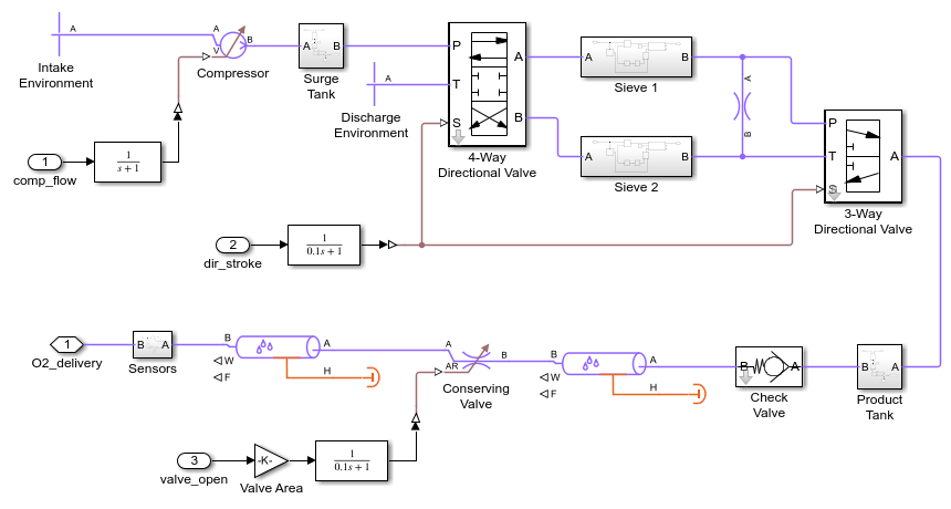 This example models an oxygen concentrator device coupled to a lung model. One of the two sieves filters out nitrogen from the air to produce concentrated oxygen in the product tank. The two sieves switches periodically so that while one sieve is filtering, the other can purge the adsorbed nitrogen. When the lung model inhales, some of the oxygen-rich gas from the product tank is mixed into the inspiratory flow.