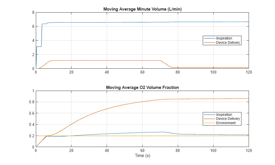 The device has two modes of operation: continuous or pulsating. The simulation starts in continuous mode, which delivers constant oxygen-rich flow to the lung model. At t = 70 s, the simulation switches to pulsating mode, which synchronizes oxygen delivery with inspiration. State Flow™ is used to estimate the breaths per minute and to control the conserving valve in the device.