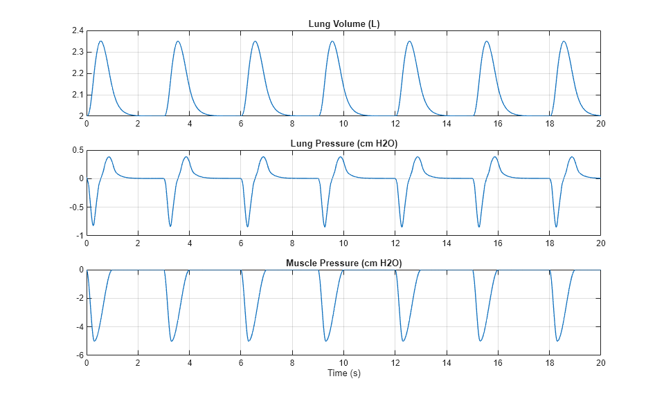 This plot shows the air pressure and volume in the lung. The lung is modeled with a simple mechanical elastance and resistance. The muscle pressure force causes the expansion of the lung volume, which lowers the lung pressure to draw in air from the mask.