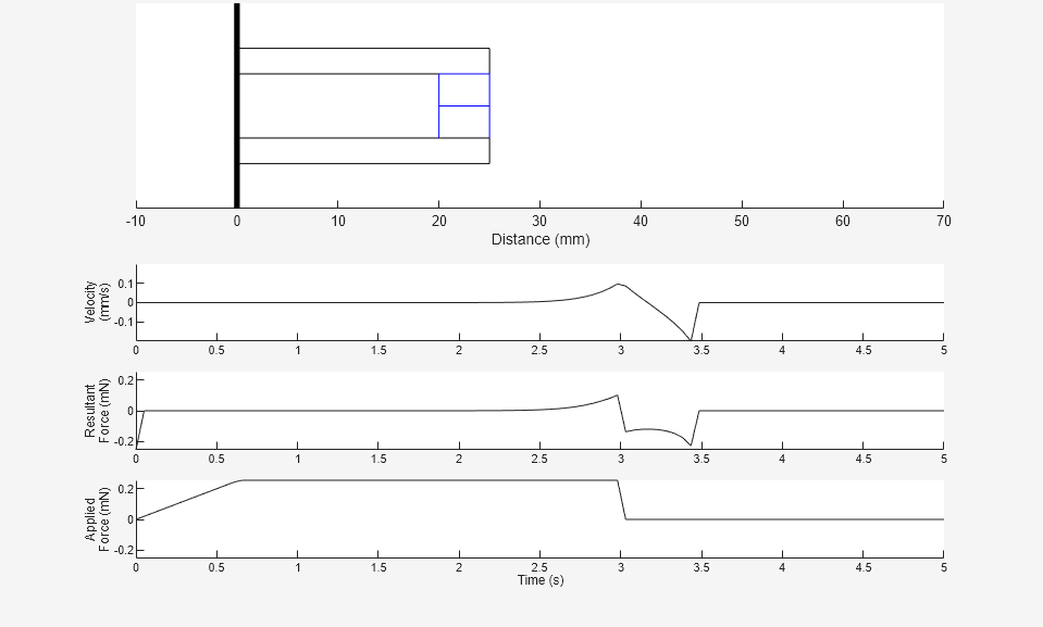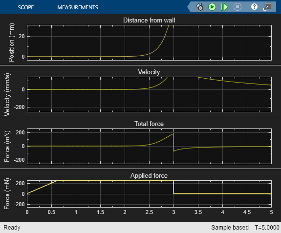 When you start the simulation, the magnet touches the wall. The Force Input block gradually increases the force on the magnet so the magnet detaches from the wall. After, the force on the magnet exceeds the critical force, the Force Input Block stops raising the applied force to prevent the magnet from moving too far from the wall. At the simulation time of 3 seconds, the Force Input block stops applying the external force causing the magnet to reattach to the wall.