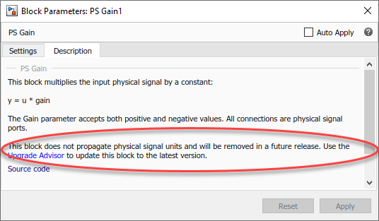 In R2019a, all blocks in the Physical Signals library have been reimplemented with untyped inputs and outputs, to facilitate signal size and unit propagation. These new blocks do not automatically replace the respective legacy blocks in your model. To upgrade your blocks to the latest version, use the Upgrade Advisor.
