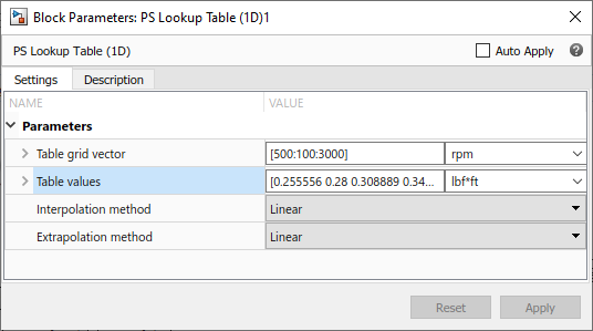 The PS Lookup Table (1D) block in this diagram contains tabulated data of torque loss, in lbf*ft, as a function of shaft speed, in rpm.