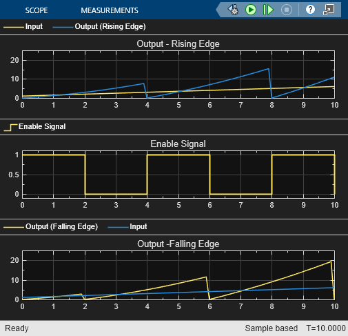 Simulink also supports the Resettable Subsystem, which executes at each time step but resets all blocks within the subsystem to their initial condition when the control signal rises or falls to zero or crosses zero. See Using Resettable Subsystems.