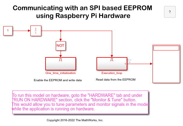 Use Simulink® Support Package for Raspberry Pi® Hardware to read from and write to an SPI EEPROM.