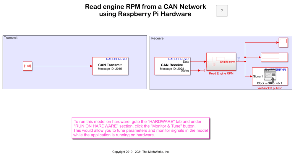 Use Simulink® Support Package for Raspberry Pi® Hardware to monitor a controller area network (CAN) bus, perform basic CAN conversions, and log CAN data in a measurable data format (MDF) file. This example also showcases the interoperability between a model deployed in Simulink and a Python program running simultaneously on Raspberry Pi hardware.
