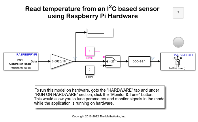 Illustrates how to use Simulink® Support Package for Raspberry Pi® Hardware to configure and read temperature from a TMP102 sensor.