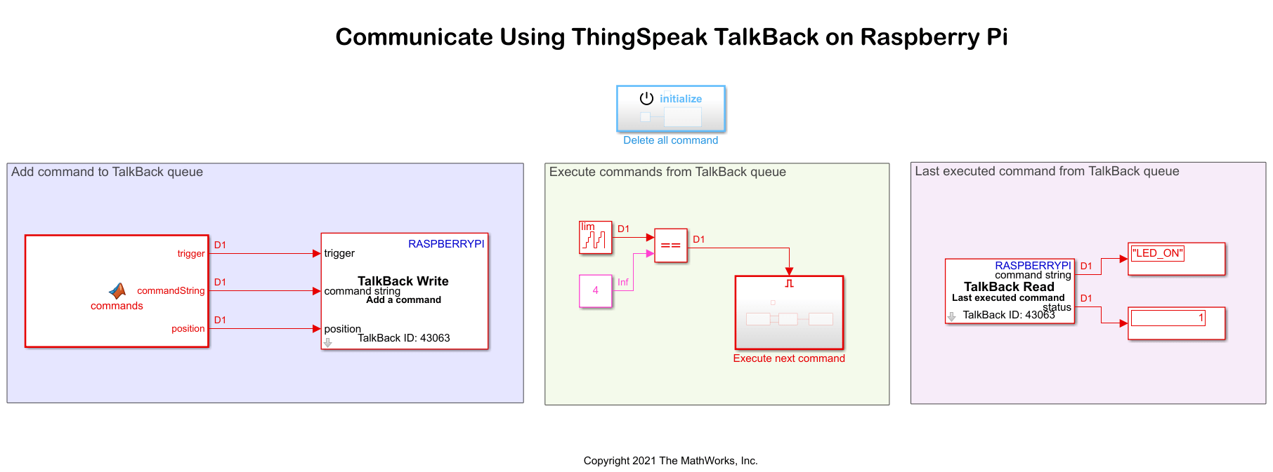 Use the Simulink® Support Package for Raspberry Pi® Hardware to fetch and execute commands from a ThingSpeak™ TalkBack queue and use them to change the status of an LED onboard a Raspberry Pi hardware board.