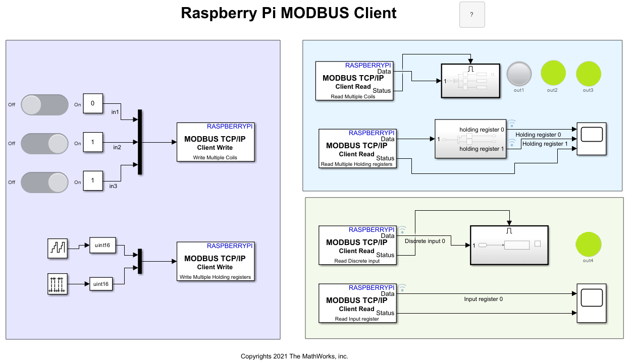 Use the Simulink® Support Package for Raspberry Pi® Hardware to implement MODBUS® TCP/IP communication between MODBUS client and server devices. It also shows how to communicate between the two devices in four modes of operation, Client Read, Client Write, Server Read, and Server Write.