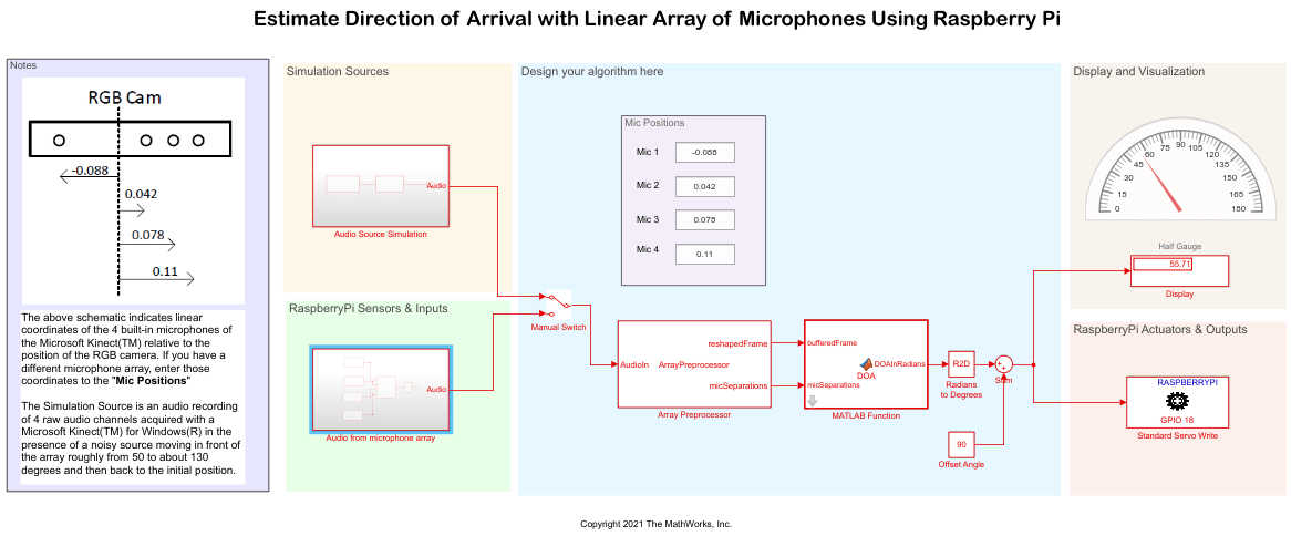 Use the Simulink® Support Package for Raspberry Pi® Hardware to estimate the Direction of Arrival (DOA) of a sound source using multiple microphone pairs within a linear array using the Raspberry Pi hardware board. A servo motor is used to point towards the sound source based on the estimated DOA.