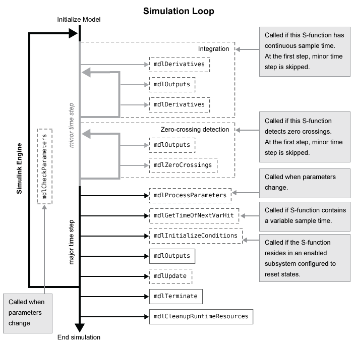 The following figures show the order in which the Simulink engine invokes the callback methods in an S-function. Solid rectangles indicate callbacks that always occur during model initialization or at every time step. Dotted rectangles indicate callbacks that may occur during initialization and/or at some or all time steps during the simulation loop. See the documentation for each callback method to determine the exact circumstances under which the engine invokes the callback.