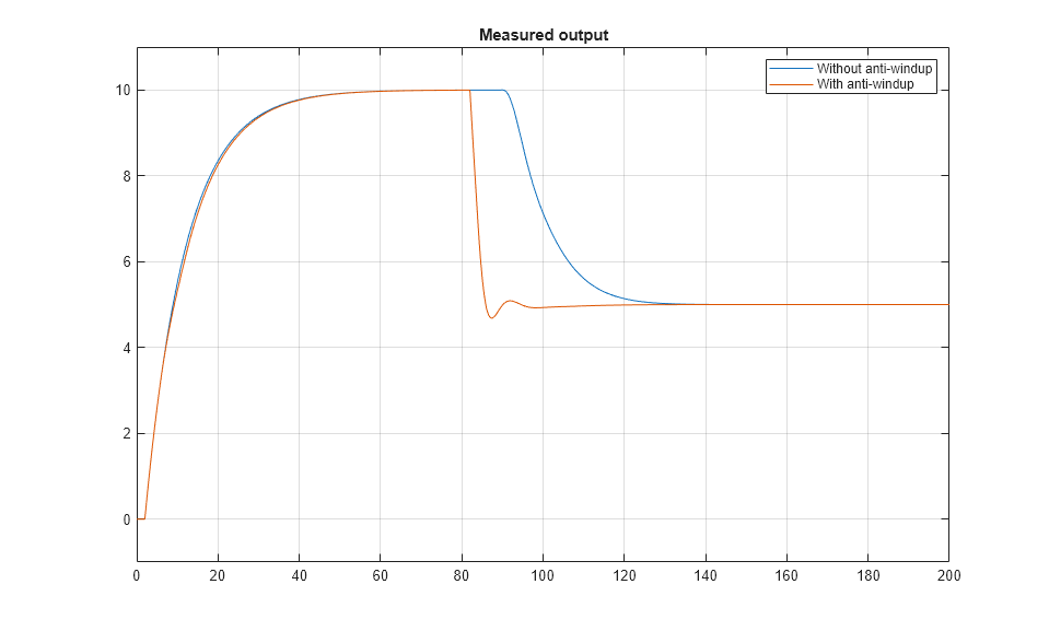 To better visualize the effect of anti-windup, this figure illustrates the plant measured output y(t) with and without anti-windup.