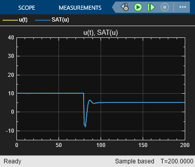 This figure shows that the controller output u(t) and the saturated input SAT(u) coincide with each other because Limit output is enabled.