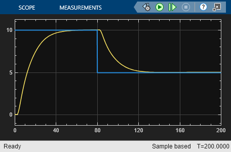 The measured output of the plant y(t) and the controller output u(t) respond almost immediately to changes in the setpoint. When the setpoint value is 10 , note how the controller output u(t) reduces to be within the range of the actuator.