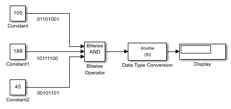 Each Constant block outputs an 8-bit unsigned integer (uint8). To determine the binary value of each Constant block output, use the dec2bin function. The results for all logic operations appear in the next table.