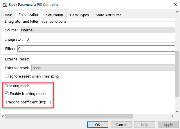 In control mode, the PID Controller block operates as an ordinary PID controller. In tracking mode, the block has an extra input that allows the PID block to adjust its internal state by changing its integrator output. The change allows the block output to track another signal input.