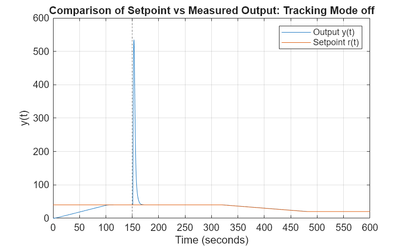 Figure contains an axes object. The axes object with title Comparison of Setpoint vs Measured Output: Tracking Mode off, xlabel Time (seconds), ylabel y(t) contains 2 objects of type line. These objects represent Output y(t), Setpoint r(t).