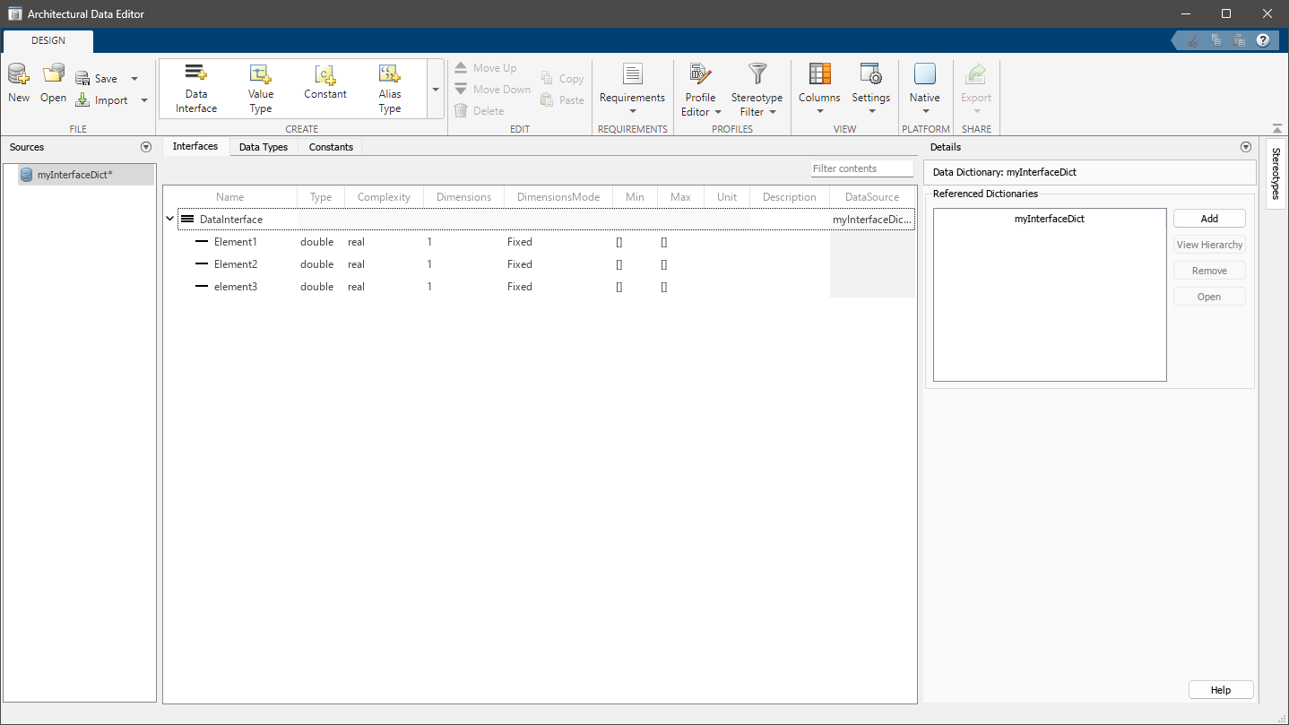Architectural data editor showing contents of the Simulink data dictionary MyInterfaces.sldd.