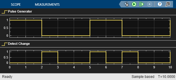 The Detect Change block determines if an input signal does not equal its previous value. The initial condition determines the initial value of the previous input U/z.