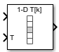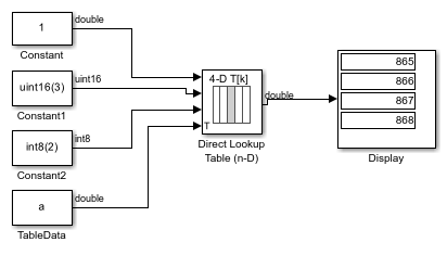 The Direct Lookup Table (n-D) block indexes into an n-dimensional table to retrieve an element, vector, or 2-D matrix. The first selection index corresponds to the top (or left) input port. You can choose to provide the table data as an input to the block, or define the table data on the block dialog box. The number of input ports and the size of the output depend on the number of table dimensions and the output slice you select.