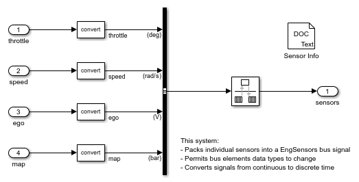 This example shows how to use a DocBlock to capture information about a model. In the sldemo_fuelsys model, a DocBlock labeled Sensor Info is used to document measurement descriptions inside of the To Controller subsystem.