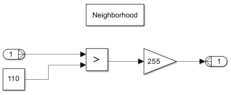 A Neighborhood Processing Subsystem that contains a GreaterThan block. The first inport of the GreaterThan block connects to the Inport block of the subsystem. The second inport of the GreaterThan block connects to a constant block with a value of 110. The outport of the GreaterThan block connects to a Gain block. The outport of the Gain block connects to the Outport block of the subsystem.