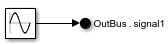 In the subsystem, a Sine Wave block connects to an Out Bus Element block. Based on the block label, OutBus.signal1, the port output is a bus that contains an element named signal1. The dot in the block label indicates the bus hierarchy.