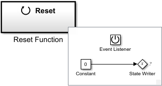 The Reset Function block is a preconfigured Subsystem block that executes on a model reset event. By default, the Reset Function block includes: